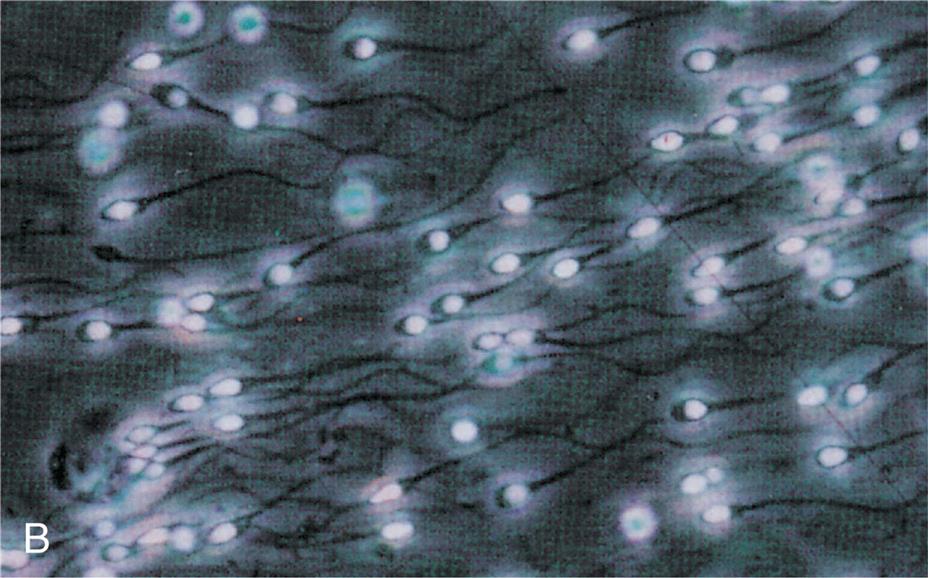 “Illustration A shows and labels the following structures of a mature sperm: head, nucleus, neck, mitochondrial sheath, body, fibrous sheath, and end piece of tail. Photomicrograph B shows a cluster of sperms swimming.”
