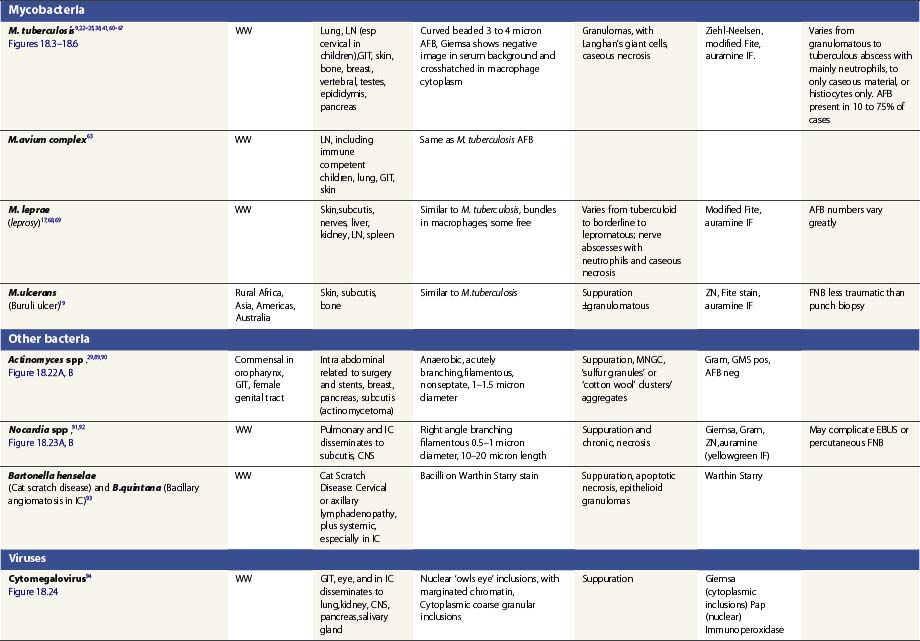 The commonest cause of granulomatous cytomorphology, and the diagnosis which must always be excluded, is that of mycobacterial infections. These are endemic worldwide and the prevalence of infections including atypical mycobacterial infections has increased with the HIV epidemic in almost all countries, especially India and sub-Saharan Africa. In developed countries, increased intercontinental travel, migration and increased numbers of IC patients of all types have fostered the resurgence of mycobacterial infections.