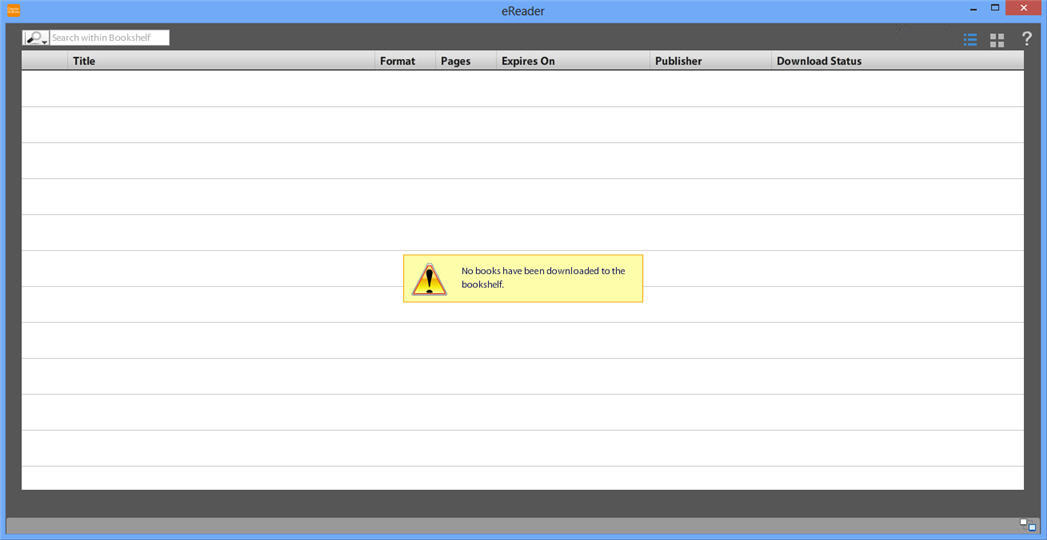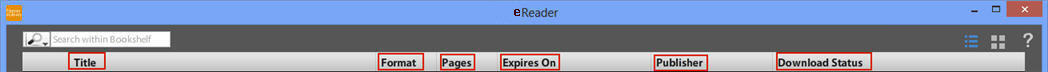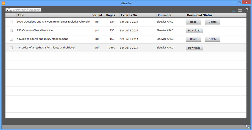 This will be your home page in the reader. It displays a list of subscribed and purchased eBooks as well as information about an eBook beside the eBook title column. It displays information like total number of pages, expiry date, name of the publisher and download status of an eBook. In addition, you can use the scroll bar in the bookshelf to scroll through the eBooks.