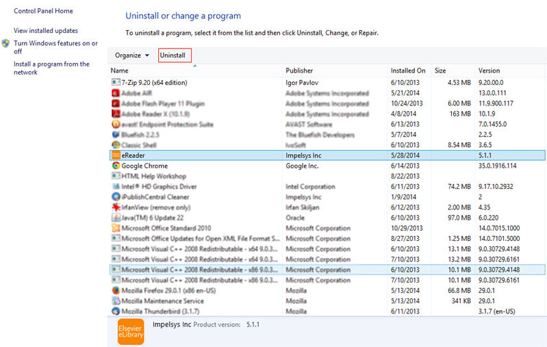To uninstall Elsevier eLibrary Reader, perform the following steps.